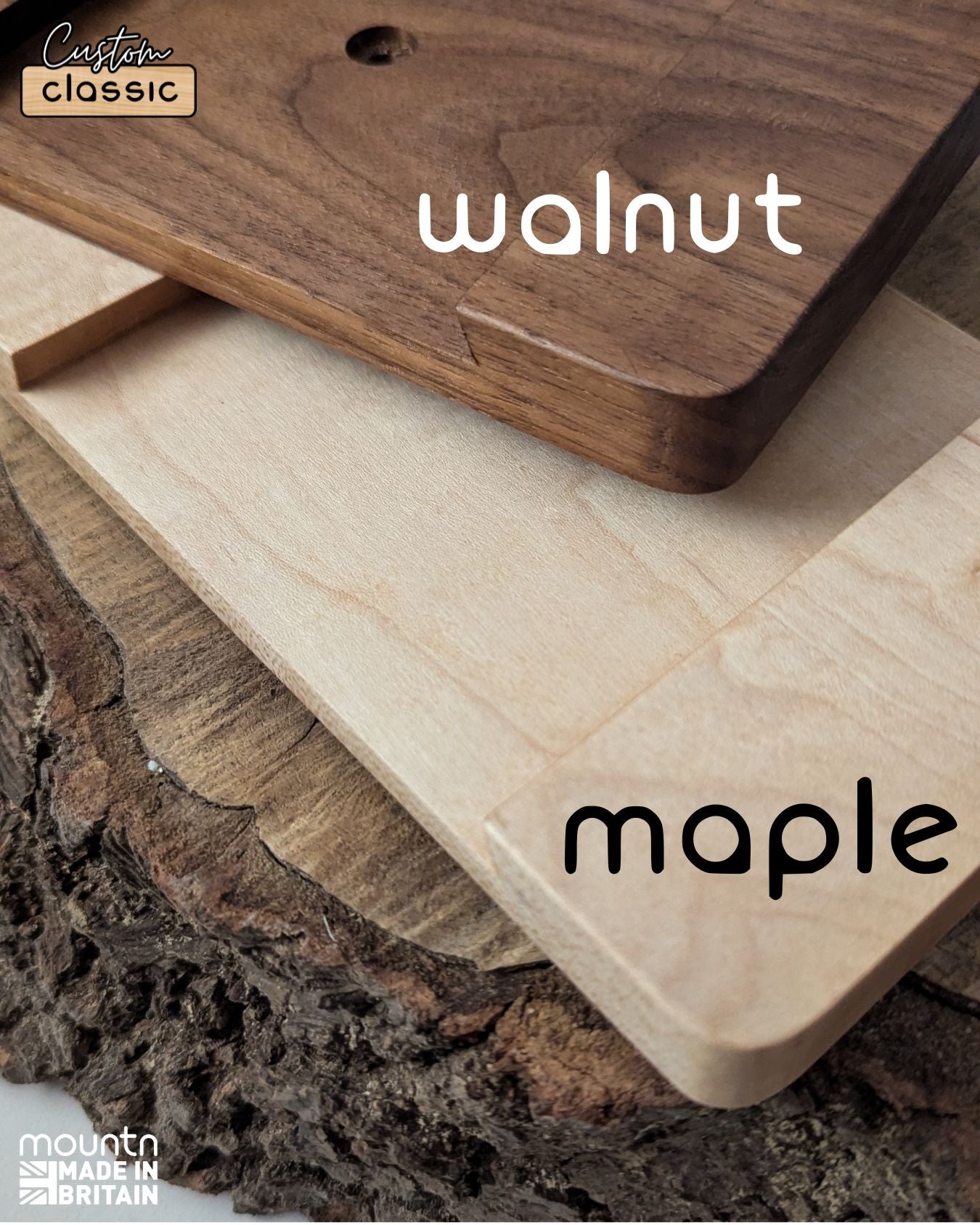 Please note that natural variations in Maple/ Walnut wood grain and colour will make each piece unique. Maple is a especially characterful timber with flame like shimmers making it particularly desirable for decorative surfaces. As such your product may vary from the images shown here.